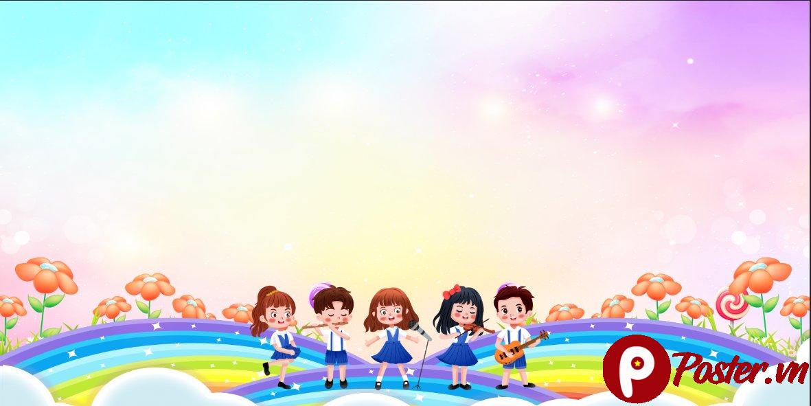 Mẫu background này nổi bật với hình ảnh các bé thiếu nhi đang vui vẻ ca hát và chơi nhạc trên một chiếc cầu vồng rực rỡ. Phía trên là bầu trời trong xanh với những đám mây bồng bềnh và những bông hoa nhỏ xinh xắn, tạo nên một khung cảnh thần tiên, tràn đầy sức sống và niềm vui. Đây là một hình ảnh lý tưởng để truyền tải thông điệp về sự hồn nhiên, sáng tạo và phát triển của trẻ thơ.