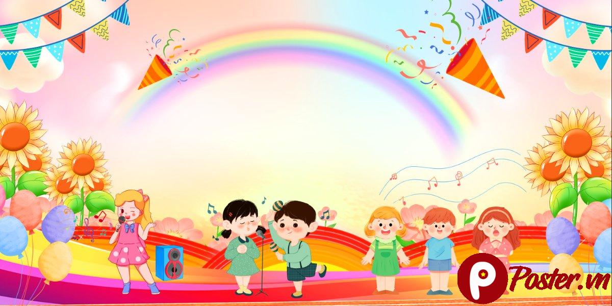 Background Sân Khấu Mầm Non Đẹp. Khám phá mẫu background sân khấu mầm non đẹp, rực rỡ sắc màu với hình ảnh cầu vồng, hoa hướng dương và các bé vui chơi. Tải ngay file vector chất lượng cao tại Poster.vn để tạo không gian sự kiện ấn tượng cho các bé.