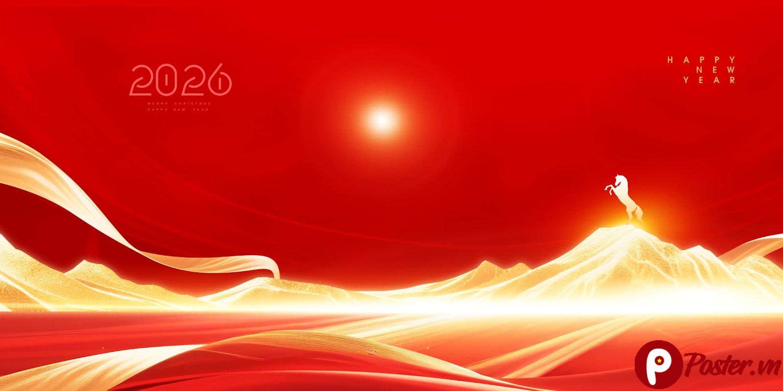 Mẫu background này sử dụng tông màu đỏ rực rỡ làm chủ đạo, kết hợp hài hòa với sắc vàng kim quý phái và màu trắng tinh khôi của chú ngựa, tạo nên một tổng thể vừa truyền thống vừa hiện đại. Những dải lụa mềm mại uốn lượn xung quanh con số 2026 không chỉ tạo chiều sâu cho khung hình mà còn tượng trưng cho sự khởi đầu hanh thông, suôn sẻ và tràn đầy hy vọng.