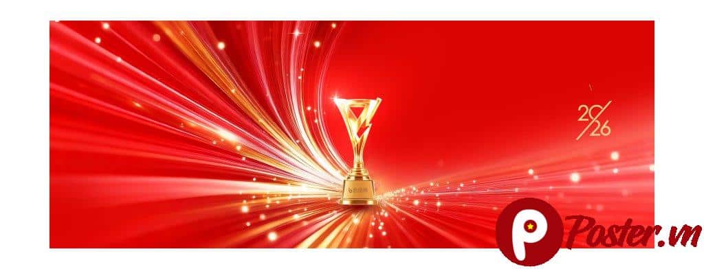 Màu đỏ chủ đạo tượng trưng cho sự nhiệt huyết, may mắn và khát vọng vươn lên. Kết hợp với màu vàng kim của chiếc cúp và ánh sáng trắng, tổng thể thiết kế toát lên vẻ đẳng cấp và chuyên nghiệp. Đây là bộ màu kinh điển thường thấy trong các sự kiện lớn của doanh nghiệp, tổ chức chính trị và thể thao.