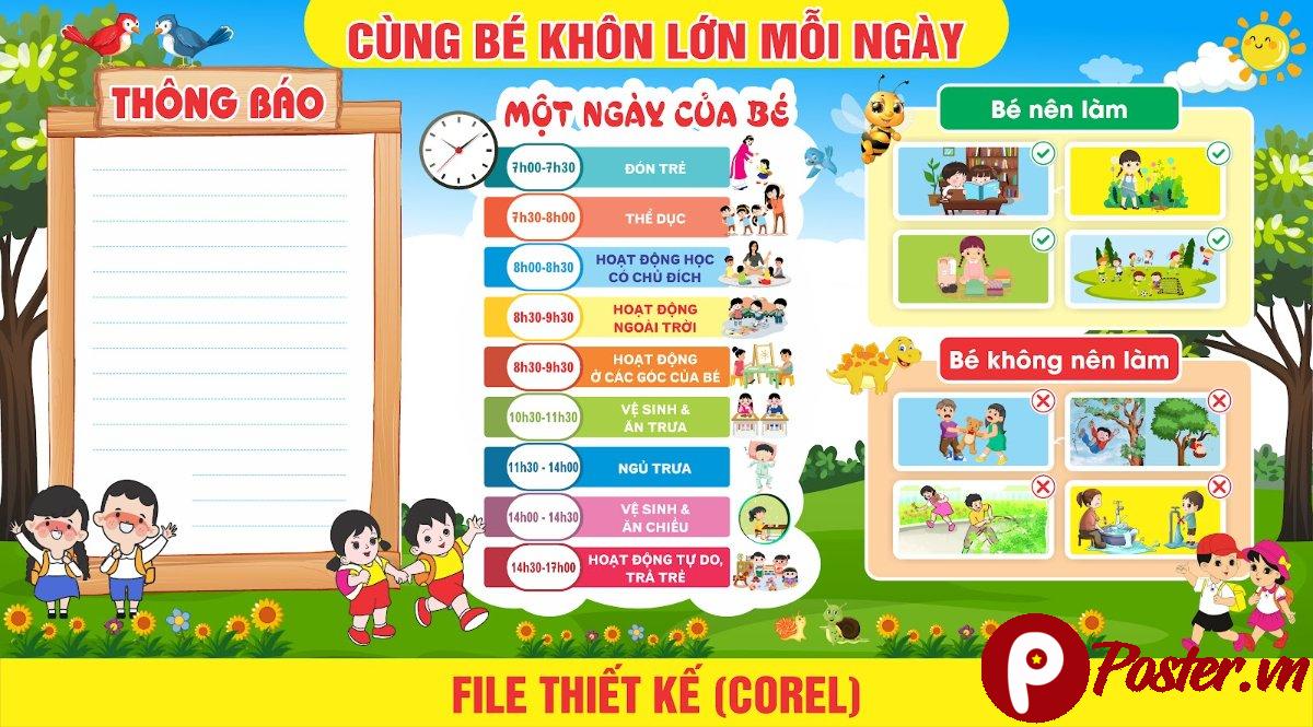 Mẫu bảng “Cùng bé khôn lớn mỗi ngày” không chỉ là một vật trang trí mà còn là một công cụ giáo dục hữu ích, giúp các bé mầm non phát triển toàn diện về thể chất, trí tuệ và đạo đức. Hãy tải ngay file Corel này từ Poster.vn để mang đến một không gian học tập và vui chơi ý nghĩa cho các bé yêu của bạn!