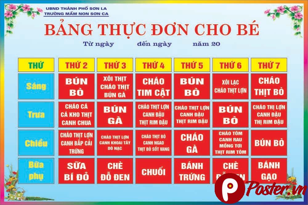 Bảng Thực Đơn Cho Bé Mầm Non. Khám phá mẫu bảng thực đơn cho bé mầm non chuẩn dinh dưỡng, thiết kế khoa học và dễ hiểu. Đảm bảo bé yêu có bữa ăn ngon miệng, đầy đủ dưỡng chất mỗi ngày với các gợi ý từ Poster.vn.