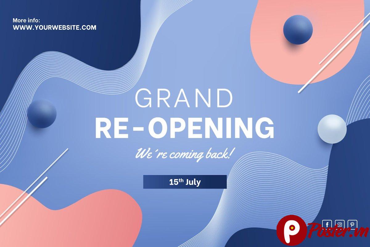 Mẫu banner này sở hữu phong cách thiết kế trừu tượng với các hình khối uốn lượn, màu sắc gradient chuyển từ xanh dương sang hồng đào, tạo cảm giác mềm mại nhưng không kém phần năng động. Sự kết hợp màu sắc này không chỉ bắt mắt mà còn mang lại cảm giác tươi mới, phù hợp với thông điệp “Grand Re-Opening – We’re coming back!” (Tái khai trương hoành tráng – Chúng tôi đã trở lại!).