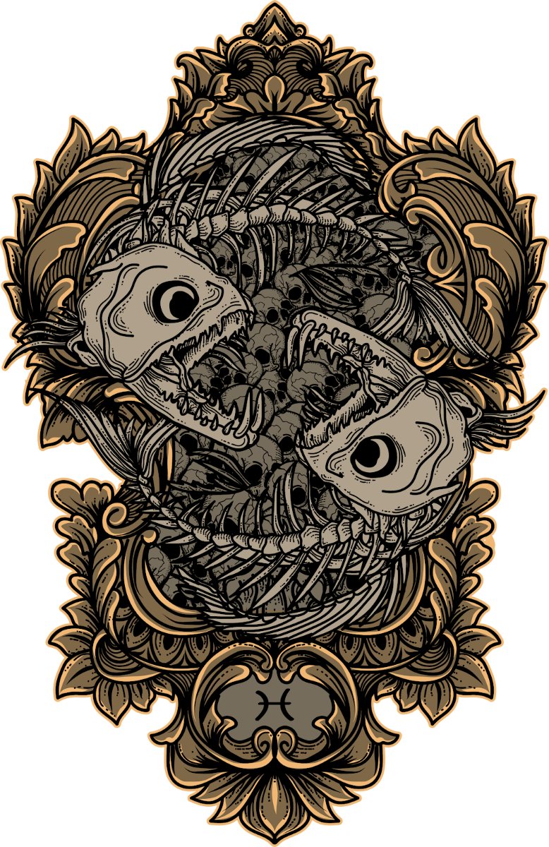 Thiết kế này nổi bật với hai bộ xương cá được sắp xếp đối xứng, tạo thành hình ảnh biểu tượng của cung Song Ngư. Mỗi chi tiết xương cá đều được khắc họa tỉ mỉ, từ hốc mắt sâu hun hút đến những chiếc răng sắc nhọn, mang đến cảm giác mạnh mẽ và có phần rùng rợn nhưng không kém phần nghệ thuật. Bao quanh hình ảnh trung tâm là những họa tiết hoa văn cổ điển, được chạm khắc tinh xảo, tạo nên một khung cảnh sang trọng và huyền bí. Sự tương phản giữa hình ảnh xương cá gai góc và những đường nét hoa văn mềm mại đã tạo nên một tổng thể hài hòa, thu hút mọi ánh nhìn.
