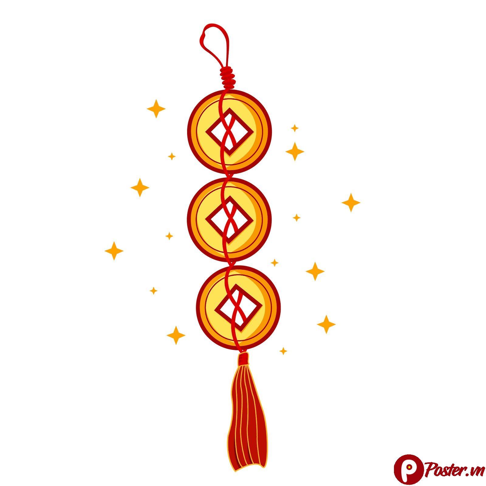 - Biểu tượng truyền thống: Chuỗi ba đồng xu cổ Trung Quốc với lỗ vuông ở trung tâm, dây xâu màu đỏ và tua rua rực rỡ là những hình ảnh quen thuộc, gợi nhớ về phong tục và giá trị văn hóa lâu đời của Tết Việt.