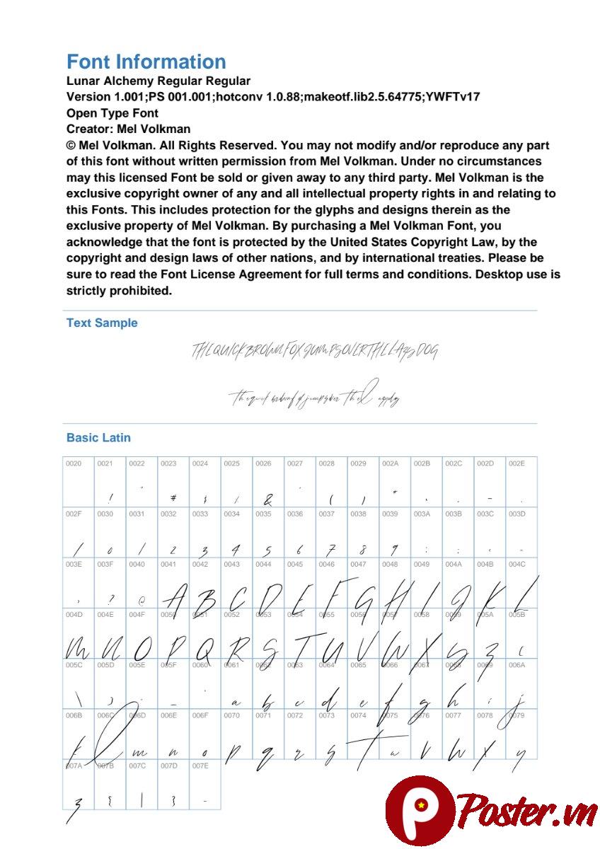 Chào mừng bạn đến với Poster.vn, nơi cung cấp những tài nguyên thiết kế chất lượng cao nhất. Hôm nay, chúng tôi hân hạnh giới thiệu đến bạn một tài nguyên font chữ đặc biệt: Lunar Alchemy Regular. Đây là một kiểu chữ viết tay (script font) mang phong cách mềm mại, uyển chuyển và đầy tính nghệ thuật, hứa hẹn sẽ làm nổi bật mọi dự án thiết kế của bạn.
