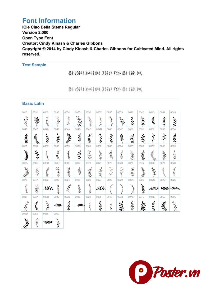 Font Ciao Bella Stems là một bộ font chữ đặc biệt, trong đó mỗi ký tự được thiết kế dưới dạng một họa tiết cành lá, hoa hoặc hình dạng trang trí tự nhiên khác, thay vì các chữ cái thông thường.