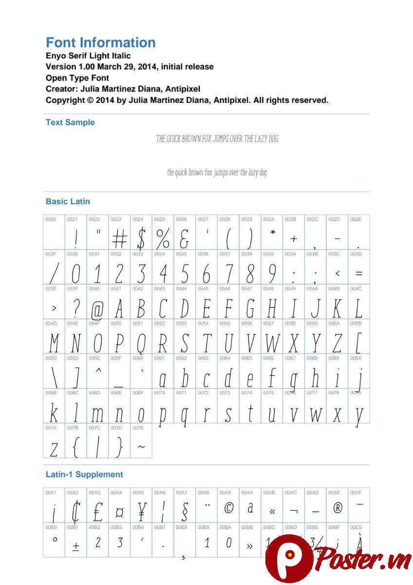 Chào mừng bạn đến với Poster.vn, nơi cung cấp hàng ngàn tài nguyên thiết kế chất lượng cao! Hôm nay, chúng tôi hân hạnh giới thiệu đến bạn một tài nguyên font chữ đặc biệt: Font Enyo Serif Light Italic. Đây là một lựa chọn tuyệt vời cho những nhà thiết kế đang tìm kiếm sự kết hợp giữa nét cổ điển của font serif và sự hiện đại, mềm mại của kiểu chữ nghiêng.