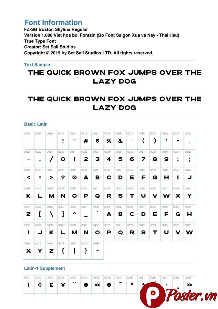Font FZ-SG Boston Skyline, được phát triển bởi Set Sail Studios, là một font chữ sans-serif với các đường nét góc cạnh, mạnh mẽ, gợi nhớ đến kiến trúc hiện đại của thành phố Boston. Đây là một TrueType Font (TTF) với phiên bản 1.000, được Việt hóa bởi Bo Font Saigon Xua va Nay – ThaiHieu, đảm bảo khả năng hiển thị tiếng Việt đầy đủ và chính xác. Sự kết hợp giữa phong cách quốc tế và khả năng hỗ trợ tiếng Việt đã làm cho font này trở thành một công cụ đắc lực cho các nhà thiết kế tại Việt Nam.
