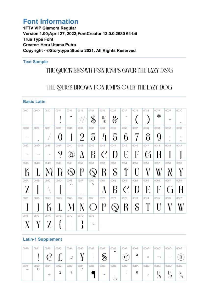 Font Glamora, cụ thể là phiên bản 1FTV VIP Glamora Regular, là một kiểu chữ TrueType được phát triển bởi Storytype Studio vào năm 2021. Với thiết kế độc đáo và các đường nét tinh xảo, Glamora không chỉ là một font chữ mà còn là một tác phẩm nghệ thuật, mang đến sự thanh lịch và đẳng cấp cho mọi ấn phẩm. Được tạo ra bởi Heru Utama Putra, font này thể hiện sự tỉ mỉ và sáng tạo trong từng chi tiết, từ các ký tự cơ bản đến các ký tự mở rộng.