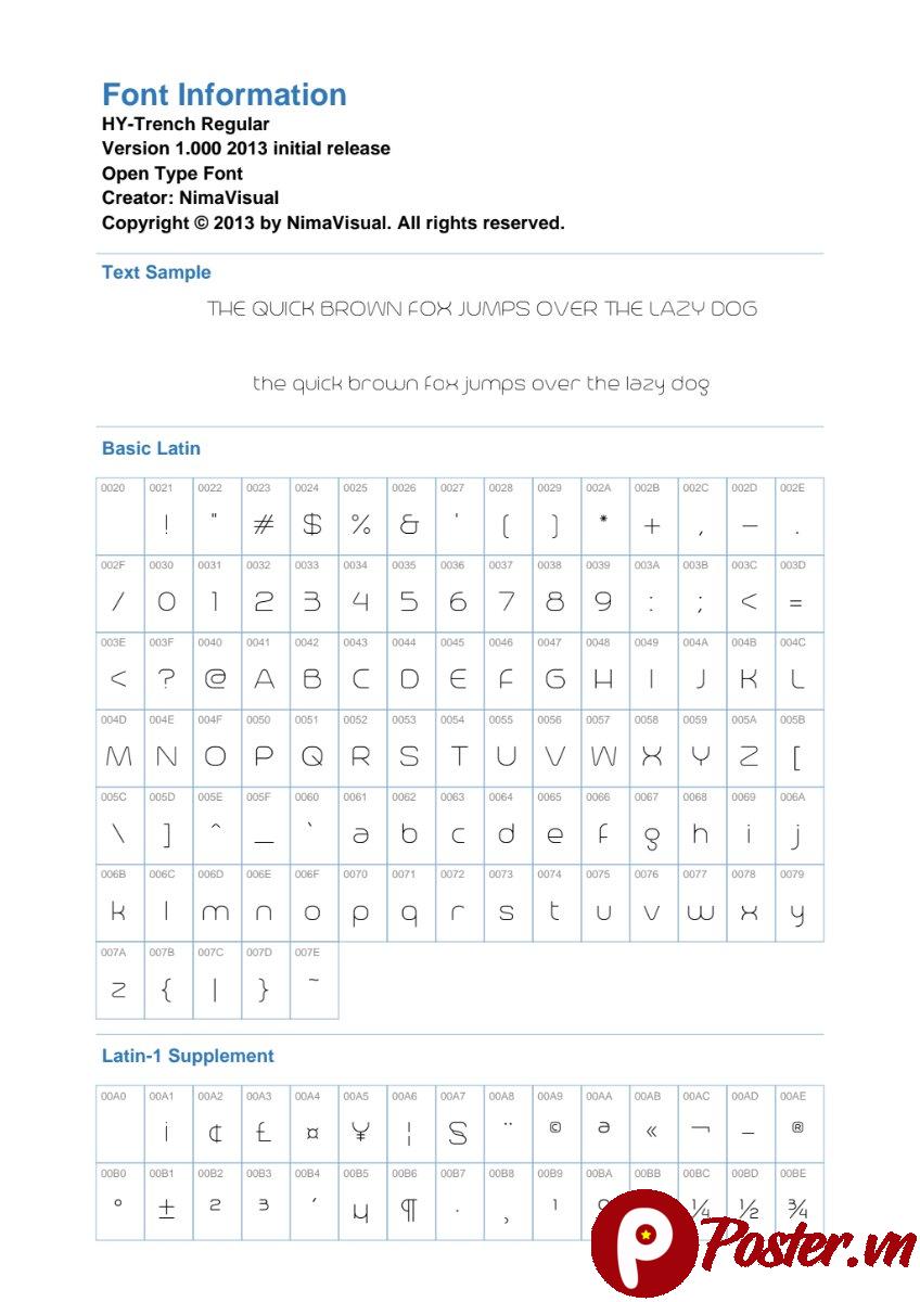 Với phiên bản 1.000, HY-Trench cung cấp đầy đủ các ký tự Latin cơ bản và bổ sung Latin-1, đảm bảo khả năng tương thích và sử dụng rộng rãi trong nhiều ngôn ngữ. Sự rõ ràng trong từng ký tự, dù có phần cách điệu, vẫn giúp người đọc dễ dàng nắm bắt thông tin, không gây khó chịu khi nhìn lâu.