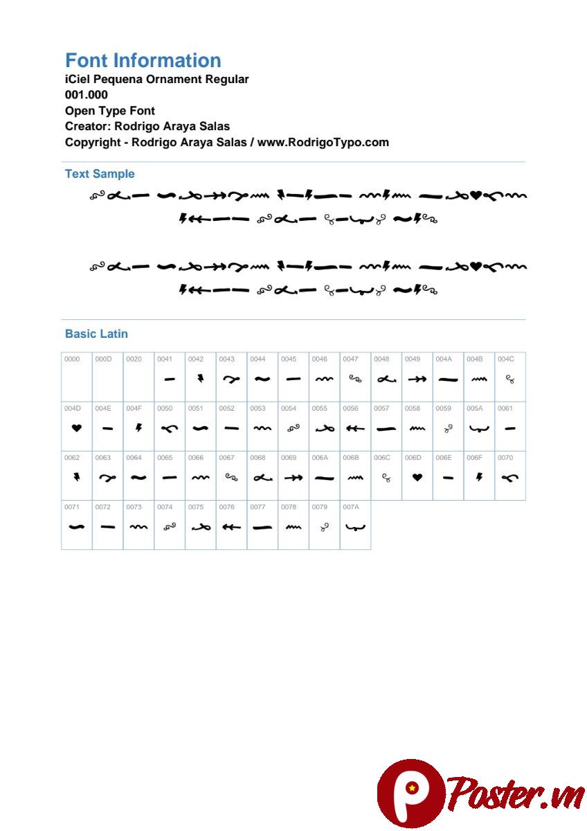 Font iCiel Pequena Ornament là một tài sản quý giá cho bất kỳ nhà thiết kế nào muốn thêm nét độc đáo và nghệ thuật vào tác phẩm của mình. Với sự tinh tế trong từng đường nét và khả năng ứng dụng đa dạng, font chữ này chắc chắn sẽ giúp bạn tạo ra những sản phẩm thiết kế ấn tượng và chuyên nghiệp. Hãy truy cập Poster.vn ngay hôm nay để khám phá và tải về font iCiel Pequena Ornament, mở ra cánh cửa cho những ý tưởng sáng tạo không giới hạn!