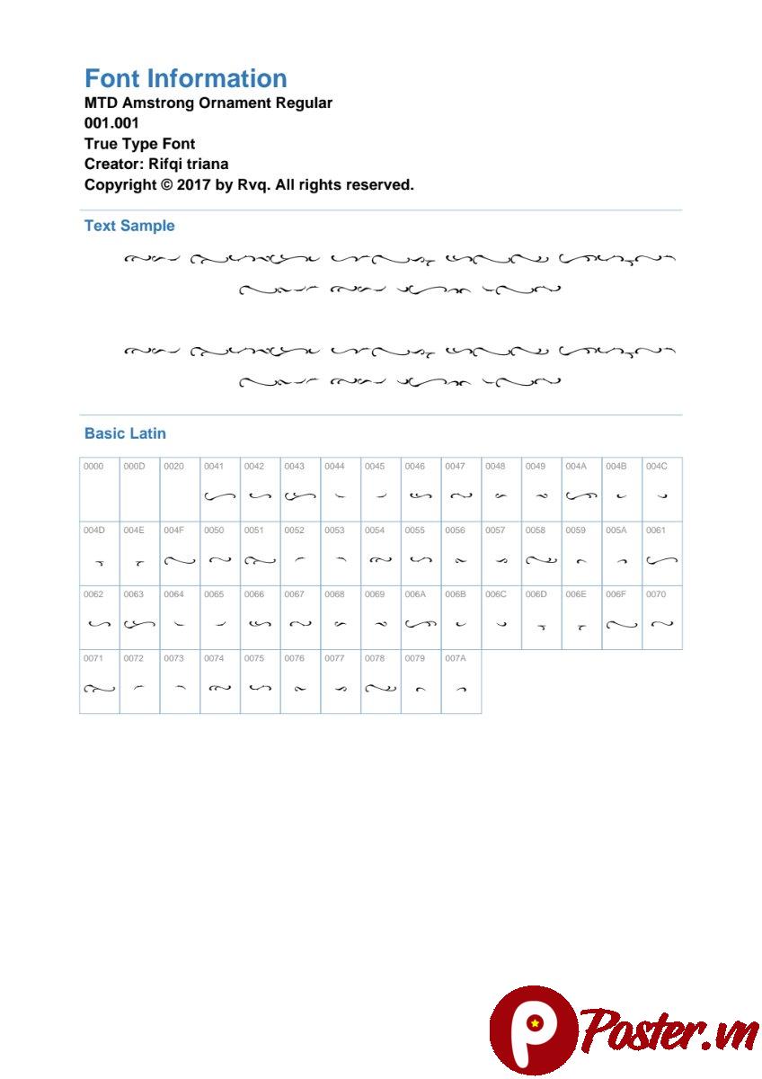 Chào mừng bạn đến với Poster.vn, nơi cung cấp hàng ngàn tài nguyên thiết kế chất lượng cao! Hôm nay, chúng tôi hân hạnh giới thiệu đến bạn một tài nguyên font chữ đặc biệt: MTD Amstrong Ornament. Đây là một font chữ trang trí độc đáo, mang đến vẻ đẹp tinh tế và sang trọng cho mọi dự án thiết kế của bạn. Với những đường nét uốn lượn mềm mại và các chi tiết trang trí cầu kỳ, MTD Amstrong Ornament chắc chắn sẽ làm nổi bật tác phẩm của bạn.