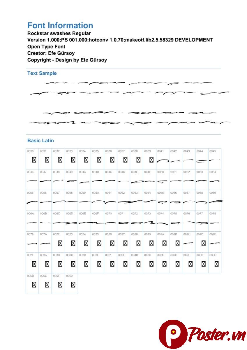 Chào mừng bạn đến với Poster.vn, nơi cung cấp hàng ngàn tài nguyên thiết kế chất lượng cao! Hôm nay, chúng tôi hân hạnh giới thiệu đến bạn một tài nguyên phông chữ đặc biệt: Font Rockstarswashes Regular. Đây là một phông chữ OpenType được thiết kế bởi Efe Gürsoy, mang đến một phong cách viết tay độc đáo và đầy cá tính, hoàn hảo cho những dự án cần sự sáng tạo và dấu ấn riêng biệt.