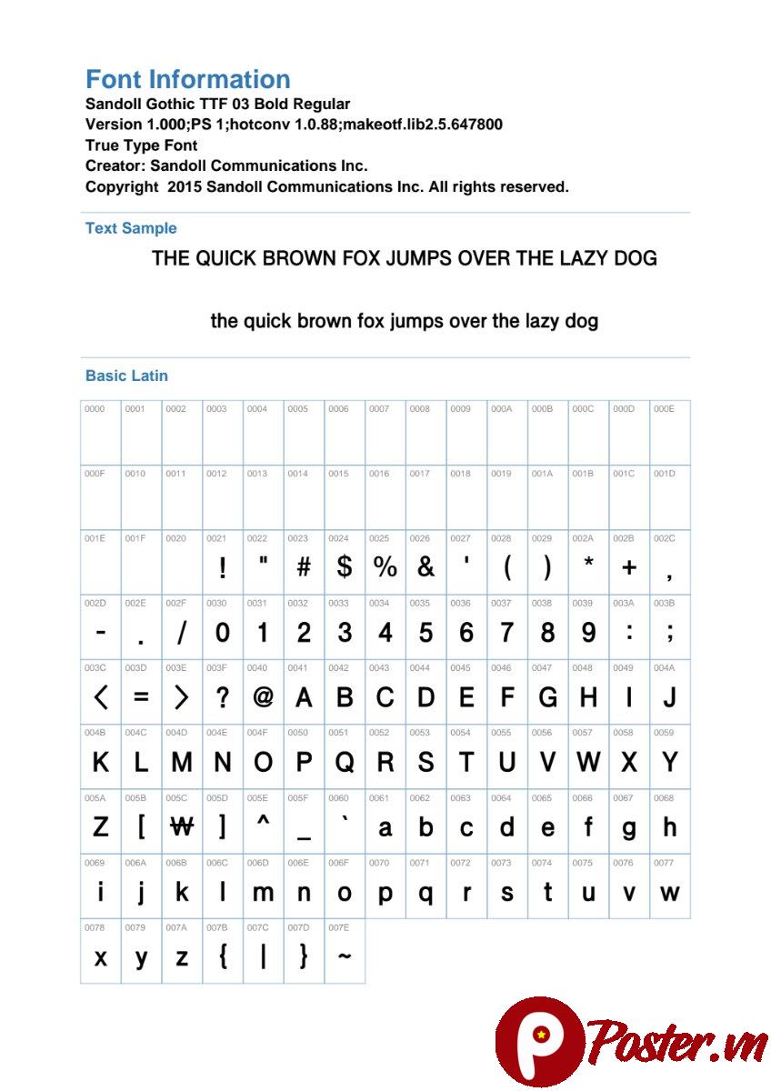 Sandoll Gothic TTF 03 Bold là một font chữ thuộc phong cách Gothic hiện đại, có độ đậm (Bold) và được thiết kế rõ ràng, mạnh mẽ, phù hợp cho nhiều mục đích thiết kế.