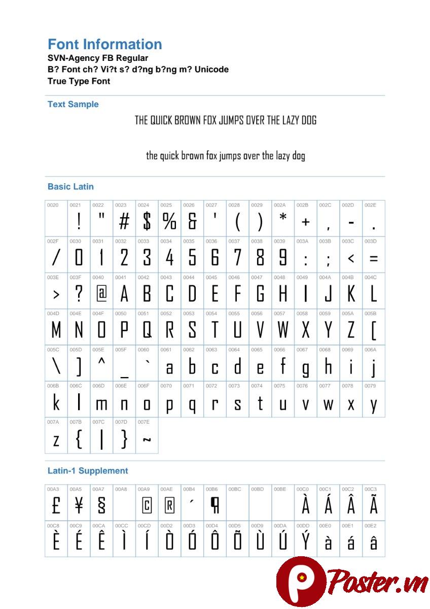 Với Font SVN-Agency FB Regular, bạn có thể tự tin tạo ra những thiết kế ấn tượng, chuyên nghiệp và thu hút. Đừng ngần ngại tải về ngay hôm nay để trải nghiệm sự khác biệt mà font chữ này mang lại cho các dự án của bạn. Poster.vn luôn đồng hành cùng bạn trên con đường sáng tạo!