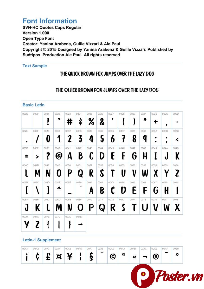 Font SVN-HC Quotes Caps là một kiểu chữ OpenType (OTF) được phát triển bởi Yanina Arabena & Guille Vizzari, và Ale Paul. Phiên bản 1.000 này được phát hành vào năm 2015, nhanh chóng trở thành lựa chọn yêu thích của nhiều nhà thiết kế nhờ vào phong cách độc đáo của nó. Với tên gọi “Quotes Caps”, font này đặc biệt nổi bật với các ký tự viết hoa được thiết kế tinh xảo, mang đến cảm giác mạnh mẽ nhưng vẫn giữ được sự mềm mại cần thiết.