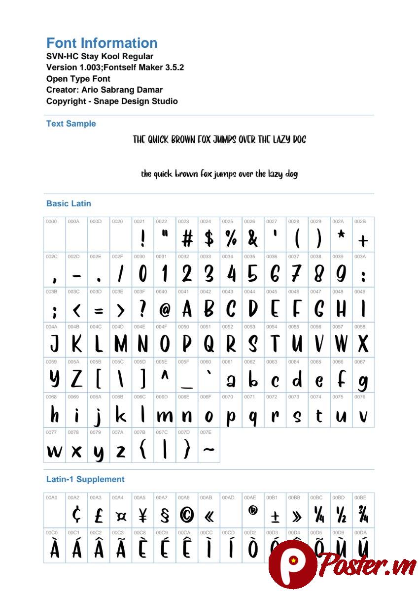 Font SVN-HC Stay Kool được thiết kế bởi Arlo Sabrang Damar và phát triển bởi Snape Design Studio, mang đậm phong cách viết tay tự nhiên, phóng khoáng. Với những nét chữ mềm mại nhưng vẫn giữ được sự mạnh mẽ, font này tạo cảm giác thân thiện, gần gũi nhưng không kém phần độc đáo. Đây là một font OpenType (OTF) với phiên bản 1.003, đảm bảo khả năng tương thích rộng rãi và hiển thị sắc nét trên nhiều nền tảng.