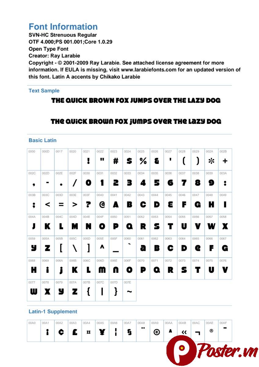 Font SVN-HC Strenuous là một công cụ mạnh mẽ trong bộ sưu tập của bất kỳ nhà thiết kế nào muốn tạo ra những tác phẩm độc đáo và đầy cá tính. Với phong cách mạnh mẽ và khả năng ứng dụng đa dạng, font này chắc chắn sẽ giúp bạn tạo ra những ấn phẩm nổi bật. Hãy truy cập Poster.vn ngay hôm nay để khám phá và tải về Font SVN-HC Strenuous cùng hàng ngàn tài nguyên thiết kế chất lượng khác, nâng tầm các dự án sáng tạo của bạn.