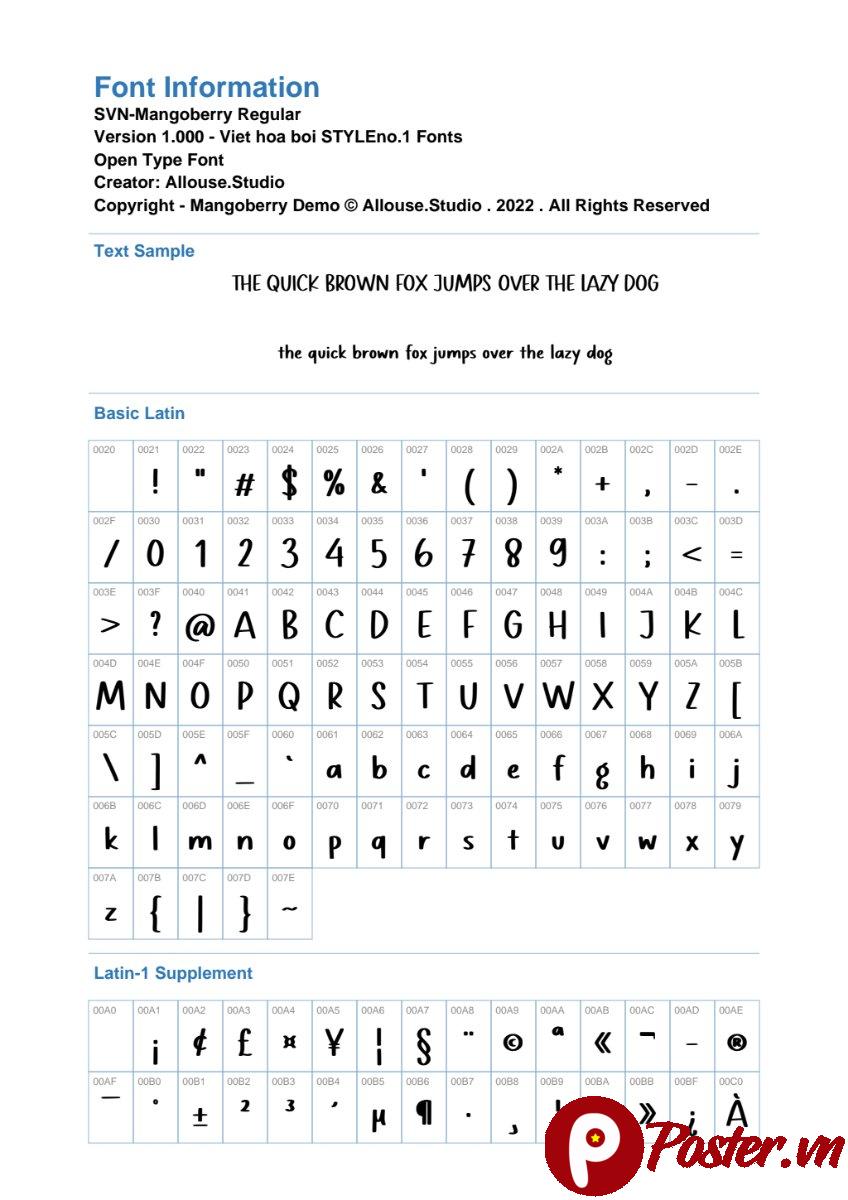 Với Font SVN-Mangoberry, bạn không chỉ có một công cụ thiết kế mà còn là một nguồn cảm hứng bất tận. Hãy để những nét chữ mềm mại, cá tính này thổi hồn vào các dự án của bạn, giúp chúng trở nên sống động và ấn tượng hơn bao giờ hết. Đừng ngần ngại truy cập Poster.vn ngay hôm nay để khám phá và tải về font chữ tuyệt vời này!