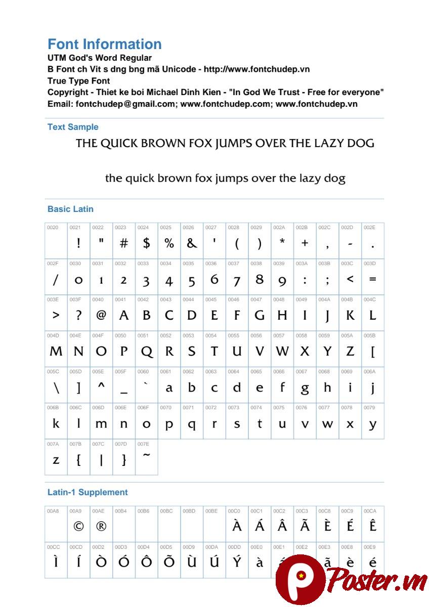 Font UTM God’s Word Regular là một tài nguyên quý giá cho bất kỳ nhà thiết kế nào muốn tạo ra những tác phẩm độc đáo và chuyên nghiệp. Với sự kết hợp giữa vẻ đẹp cổ điển và hiện đại, cùng với khả năng hỗ trợ tiếng Việt đầy đủ, font chữ này chắc chắn sẽ làm hài lòng cả những khách hàng khó tính nhất. Hãy truy cập Poster.vn ngay hôm nay để tải về và trải nghiệm sự khác biệt mà Font UTM God’s Word Regular mang lại!