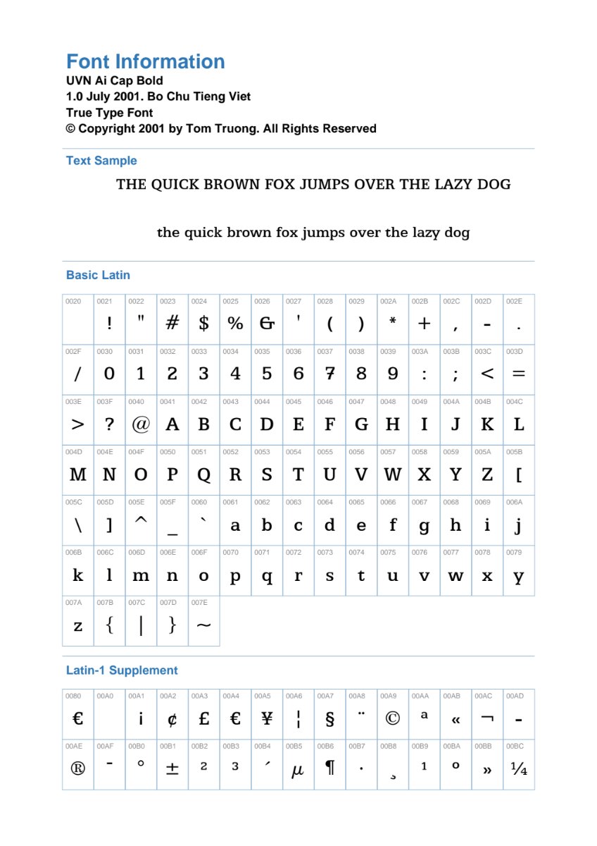 Font UVN Ai Cap Bold được phát triển bởi Tom Truong vào năm 2001, là một font TrueType với thiết kế mạnh mẽ và dễ đọc. Điểm đặc biệt của font này là khả năng hỗ trợ bộ ký tự tiếng Việt đầy đủ (Bo Chu Tieng Viet), giúp các nhà thiết kế Việt Nam dễ dàng tạo ra các sản phẩm chất lượng mà không gặp phải lỗi hiển thị font.