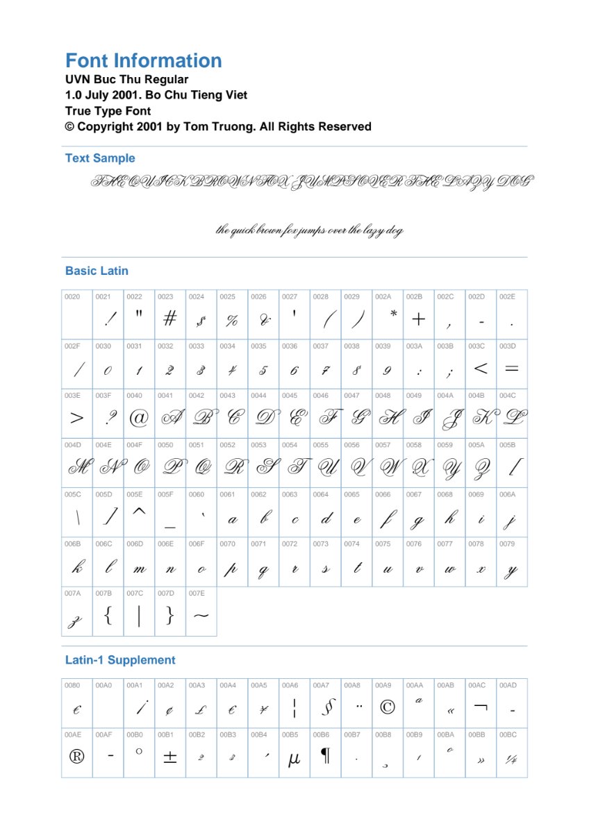 Font UVN Bức Thư Regular là một phông chữ viết tay (script font) được thiết kế bởi Tom Truong vào năm 2001. Đây là một phông chữ TrueType (TTF) với bộ ký tự tiếng Việt đầy đủ, mang đến sự linh hoạt và sáng tạo cho người dùng. Đặc trưng bởi những nét chữ mềm mại, bay bổng như những dòng thư viết tay, phông chữ này tạo cảm giác gần gũi, thân thiện nhưng không kém phần sang trọng và tinh tế.