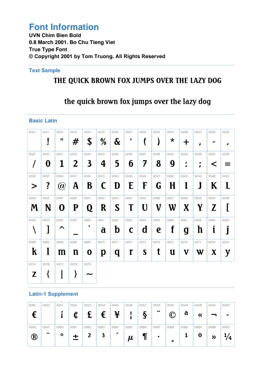 Trong thế giới thiết kế đồ họa, việc lựa chọn font chữ phù hợp có thể tạo nên sự khác biệt lớn cho tác phẩm của bạn. Hôm nay, Poster.vn hân hạnh giới thiệu đến bạn một tài nguyên font chữ đặc biệt: UVN Chim Bien Bold. Đây là một font TrueType được phát triển bởi Tom Truong vào ngày 08 tháng 3 năm 2001, nổi bật với khả năng hỗ trợ tiếng Việt đầy đủ và phong cách mạnh mẽ, rõ ràng.