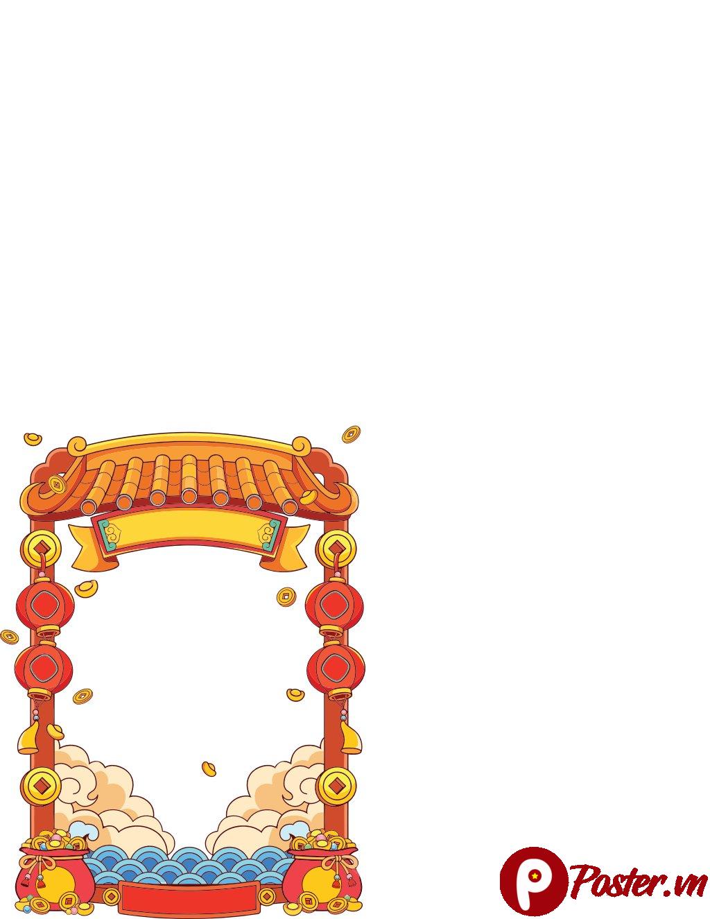 Thiết kế này nổi bật với phong cách hoạt hình tươi sáng, đường nét rõ ràng và màu sắc rực rỡ, chủ đạo là đỏ và vàng kim – những gam màu biểu tượng cho may mắn, thịnh vượng và tài lộc trong văn hóa Á Đông. Khung viền được trang trí công phu với hình ảnh mái nhà truyền thống, đèn lồng đỏ, những đồng tiền vàng cổ lấp lánh, túi tiền đầy ắp và những làn mây, sóng nước mềm mại. Tất cả hòa quyện tạo nên một bức tranh lễ hội sống động, mang đến cảm giác vui tươi, ấm áp và tràn đầy hy vọng. Với tài nguyên này, việc tạo ra các thiết kế độc đáo, thu hút và mang đậm không khí Tết trở nên dễ dàng hơn bao giờ hết, giúp bạn truyền tải trọn vẹn thông điệp về sự sung túc và hạnh phúc đến mọi người.