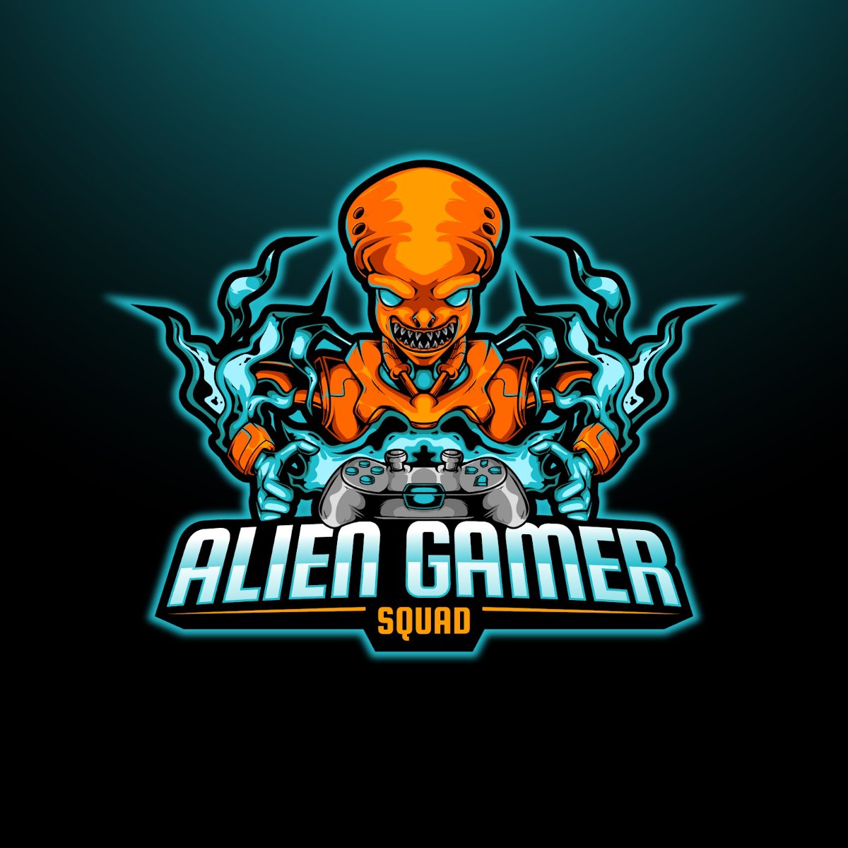 Mẫu logo này khắc họa hình ảnh một sinh vật ngoài hành tinh (alien) với vẻ ngoài mạnh mẽ, bí ẩn và đầy quyết tâm, đang điều khiển tay cầm chơi game. Thiết kế này không chỉ thể hiện tinh thần chiến đấu, sự tập trung cao độ của game thủ mà còn mang đến một phong cách hiện đại, đậm chất khoa học viễn tưởng. Màu sắc chủ đạo là cam rực rỡ kết hợp với xanh lam điện tử, tạo nên sự tương phản mạnh mẽ, thu hút ánh nhìn ngay lập tức. Hiệu ứng khói và ánh sáng neon bao quanh nhân vật càng làm tăng thêm vẻ huyền bí và sức mạnh, rất phù hợp với các đội game chuyên nghiệp hoặc streamer muốn xây dựng hình ảnh cá tính.