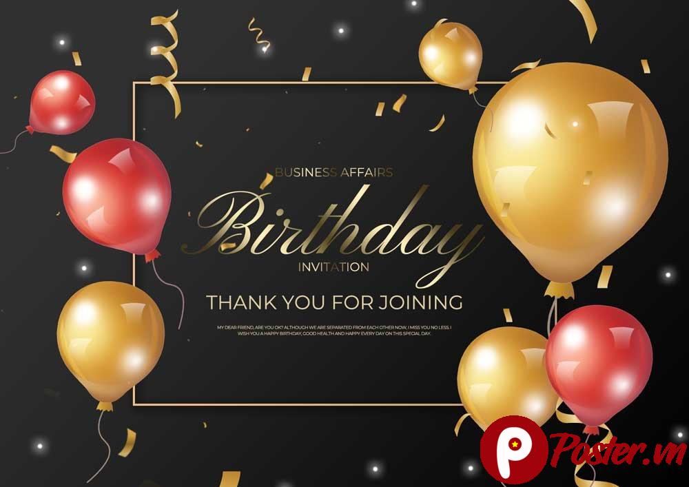 Mẫu banner sinh nhật này nổi bật với tông màu chủ đạo là đen và vàng đồng, tạo nên vẻ ngoài cực kỳ sang trọng và tinh tế. Trên nền đen huyền bí, những quả bóng bay lấp lánh màu vàng và đỏ được bố trí khéo léo, mang đến cảm giác vui tươi và ấm cúng. Những dải ruy băng vàng óng ánh bay lượn nhẹ nhàng xung quanh, càng làm tăng thêm sự sống động và cuốn hút cho thiết kế. Chính giữa banner là khung chữ “Birthday Invitation” được cách điệu mềm mại, kết hợp với dòng chữ “Business Affairs” và “Thank You For Joining”, thích hợp cho các buổi tiệc sinh nhật thân mật hoặc sự kiện kỷ niệm của công ty.