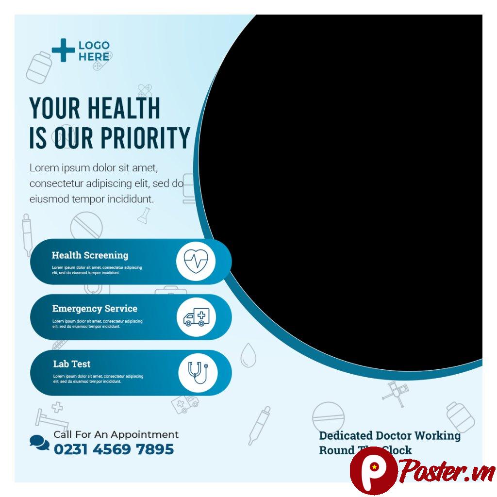 Mẫu banner này sở hữu bố cục khoa học, màu sắc hài hòa (chủ yếu là xanh dương và trắng) tạo cảm giác tin cậy và chuyên nghiệp. Các biểu tượng y tế được sử dụng một cách khéo léo, giúp người xem dễ dàng nắm bắt thông tin về các dịch vụ như khám sức khỏe tổng quát, dịch vụ cấp cứu, xét nghiệm. Phần không gian trống lớn được dành riêng để bạn có thể chèn hình ảnh bác sĩ, cơ sở vật chất hoặc logo của mình, tạo nên sự cá nhân hóa tối đa.