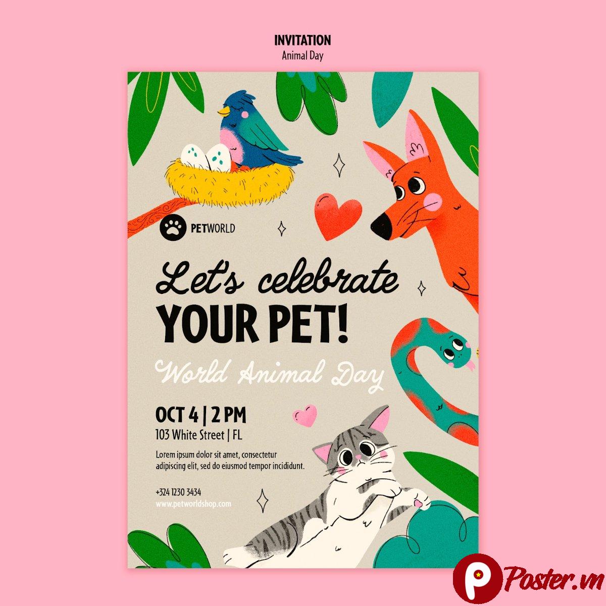 Ngày Động Vật Thế Giới (4 tháng 10) là dịp để chúng ta tôn vinh và nâng cao nhận thức về quyền lợi của động vật. Việc sử dụng một mẫu giấy mời chuyên nghiệp và ý nghĩa sẽ giúp sự kiện của bạn trở nên đặc biệt hơn, thu hút nhiều người tham gia và lan tỏa thông điệp yêu thương động vật đến cộng đồng. Hãy để mẫu giấy mời “Let’s celebrate your pet! World Animal Day” từ Poster.vn giúp bạn tạo nên một sự kiện đáng nhớ.