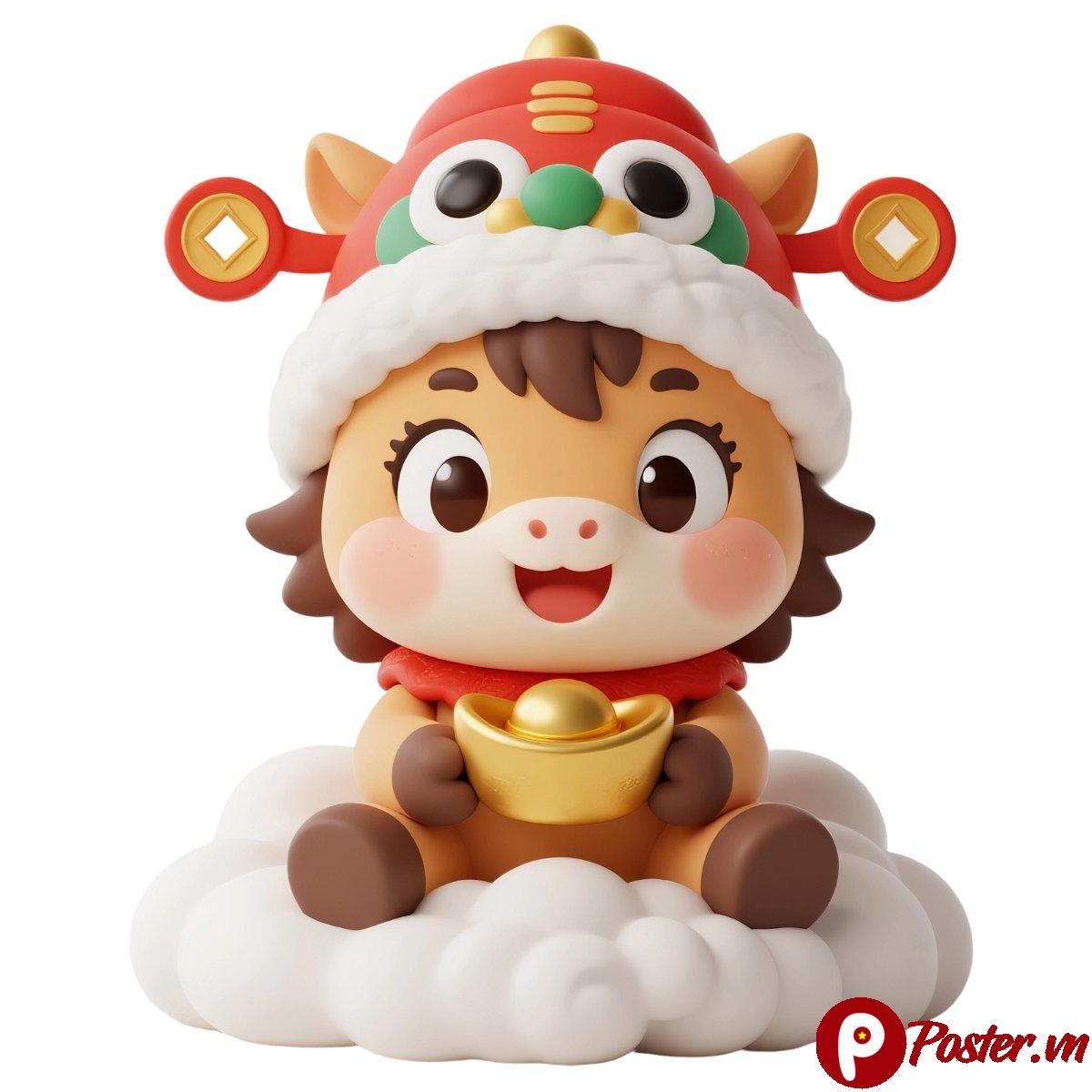 Màu sắc chủ đạo là đỏ và vàng, hai gam màu may mắn và thịnh vượng trong văn hóa Á Đông. Màu đỏ tượng trưng cho sự may mắn, niềm vui và năng lượng tích cực, trong khi màu vàng biểu thị sự giàu sang, phú quý và thành công. Những chi tiết nhỏ như đôi mắt to tròn, má hồng và nụ cười rạng rỡ càng làm tăng thêm vẻ đáng yêu và thân thiện cho nhân vật.