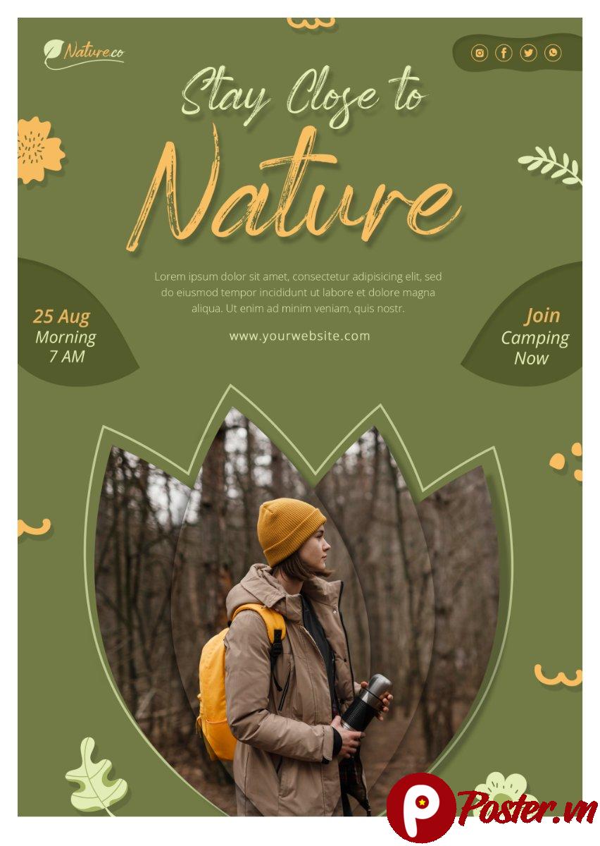 Mẫu poster này nổi bật với tông màu xanh lá cây chủ đạo, mang đến cảm giác gần gũi, tươi mát và thân thiện với môi trường. Các yếu tố đồ họa như lá cây, hoa và biểu tượng thiên nhiên được sắp xếp tinh tế, tạo nên một bố cục hài hòa và thu hút. Điểm nhấn là hình ảnh một người phụ nữ với chiếc balo đang tận hưởng không gian rừng cây, được lồng ghép khéo léo trong khung hình bông hoa cách điệu, thể hiện rõ tinh thần “Stay Close to Nature” (Gần gũi với thiên nhiên).