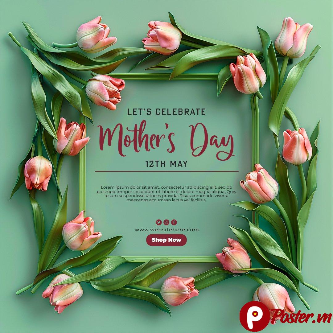 Mẫu được thiết kế với bố cục khoa học, giúp bạn dễ dàng chèn nội dung thông điệp, chương trình khuyến mãi hoặc lời chúc. Phần trung tâm là không gian lý tưởng để bạn đặt tiêu đề “Let’s Celebrate Mother’s Day” cùng ngày kỷ niệm “12th May” và các thông tin chi tiết khác như “Shop Now” hoặc địa chỉ website/mạng xã hội. Điều này giúp người dùng dễ dàng nắm bắt thông tin quan trọng mà bạn muốn truyền tải.
