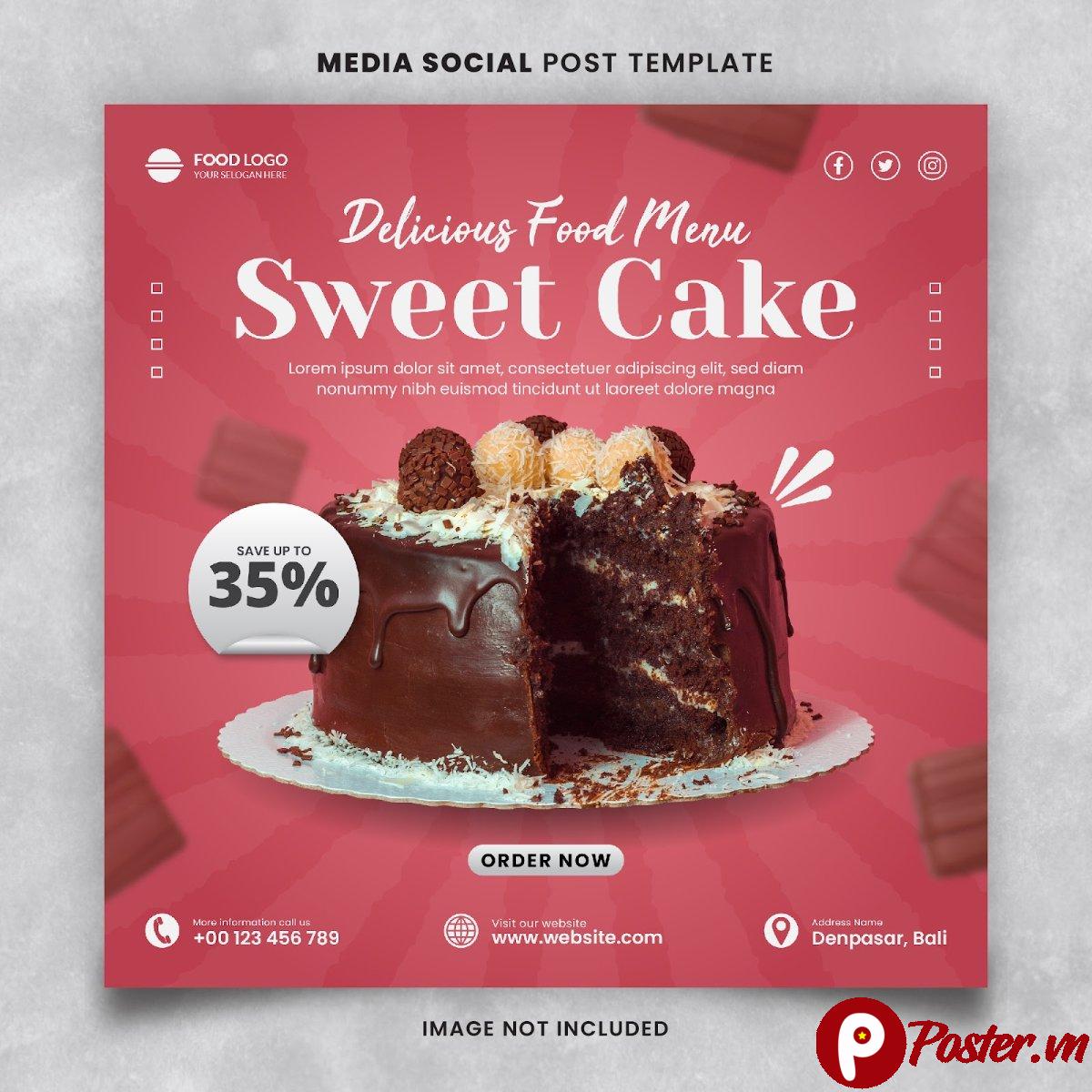 Mẫu tích hợp sẵn các khu vực để bạn điền thông tin quan trọng như tên món ăn (Sweet Cake), mô tả ngắn gọn, giá khuyến mãi (Save up to 35%), nút kêu gọi hành động (Order Now), thông tin liên hệ (số điện thoại, website, địa chỉ). Điều này giúp bạn tạo ra một bài đăng quảng cáo đầy đủ và hiệu quả, khuyến khích khách hàng tương tác và mua hàng.