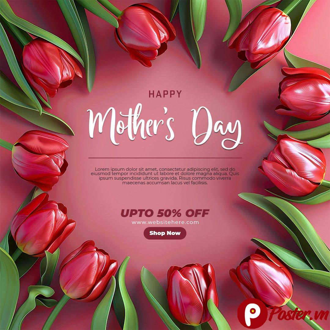 Mẫu social post này được thiết kế với tông màu hồng chủ đạo, mang lại cảm giác ấm áp, dịu dàng và tràn đầy tình yêu thương. Điểm nhấn chính là những bông hoa tulip đỏ tươi tắn, được sắp xếp khéo léo tạo thành một vòng tròn bao quanh dòng chữ “Happy Mother’s Day” nổi bật. Đây là biểu tượng của tình yêu, sự trân trọng và lòng biết ơn sâu sắc dành cho mẹ.
