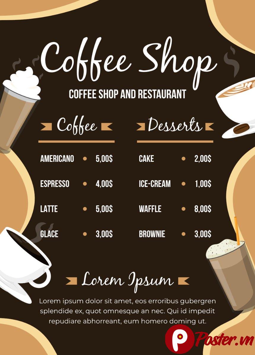 Bố cục của menu được chia thành các phần rõ ràng: “Coffee” và “Desserts”, giúp khách hàng dễ dàng định vị và tìm kiếm món mình yêu thích. Mỗi mục đều có tên món, giá cả được trình bày mạch lạc, không gây rối mắt. Phần “Lorem Ipsum” ở cuối menu cung cấp không gian để bạn thêm vào thông điệp đặc biệt, giới thiệu về quán hoặc các chương trình khuyến mãi.