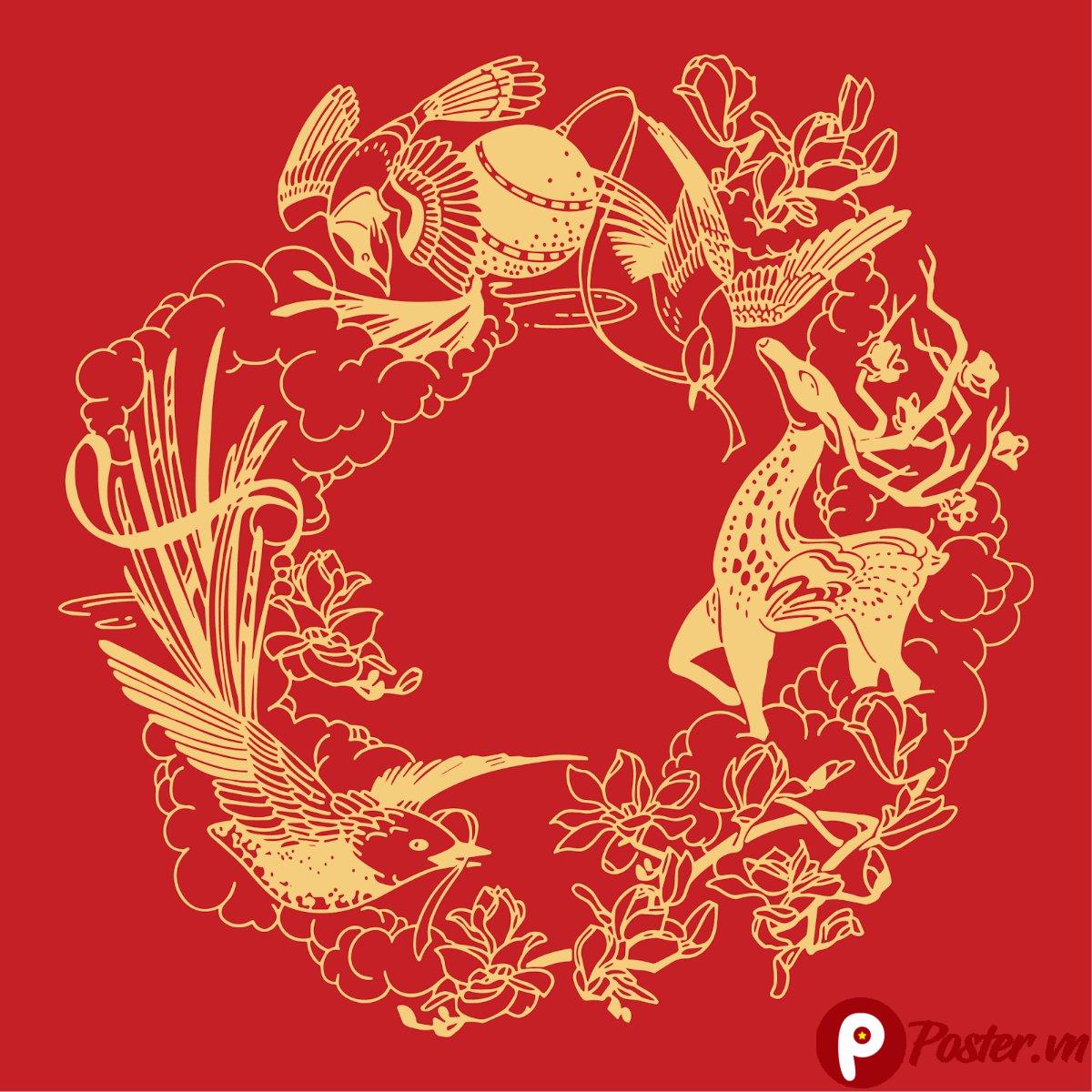 “MINH HOA – 05” là một tác phẩm đồ họa tinh xảo, được thiết kế với cảm hứng từ nghệ thuật truyền thống Á Đông. Hình ảnh trung tâm là một vòng tròn được tạo nên từ những đám mây, chim hạc, và một con hươu, tất cả đều được cách điệu theo phong cách cổ điển, mang đến vẻ đẹp thanh tao và ý nghĩa sâu sắc. Màu sắc chủ đạo là vàng trên nền đỏ, tạo nên sự sang trọng, ấm cúng và may mắn, rất phù hợp với không khí Tết.