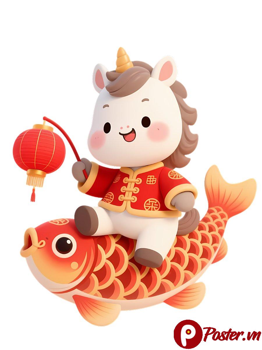 Mẫu thiết kế ngựa 3D cưỡi cá chép của Poster.vn được tạo hình với phong cách hoạt hình dễ thương, màu sắc tươi sáng, rực rỡ, rất phù hợp với không khí vui tươi của ngày Tết. Chú ngựa nhỏ nhắn, đáng yêu trong trang phục truyền thống, tay cầm đèn lồng đỏ, cưỡi trên lưng chú cá chép vàng óng ánh, tạo nên một khung cảnh tràn đầy hy vọng và niềm vui. Đây chắc chắn sẽ là điểm nhấn ấn tượng cho các ấn phẩm Tết của bạn.