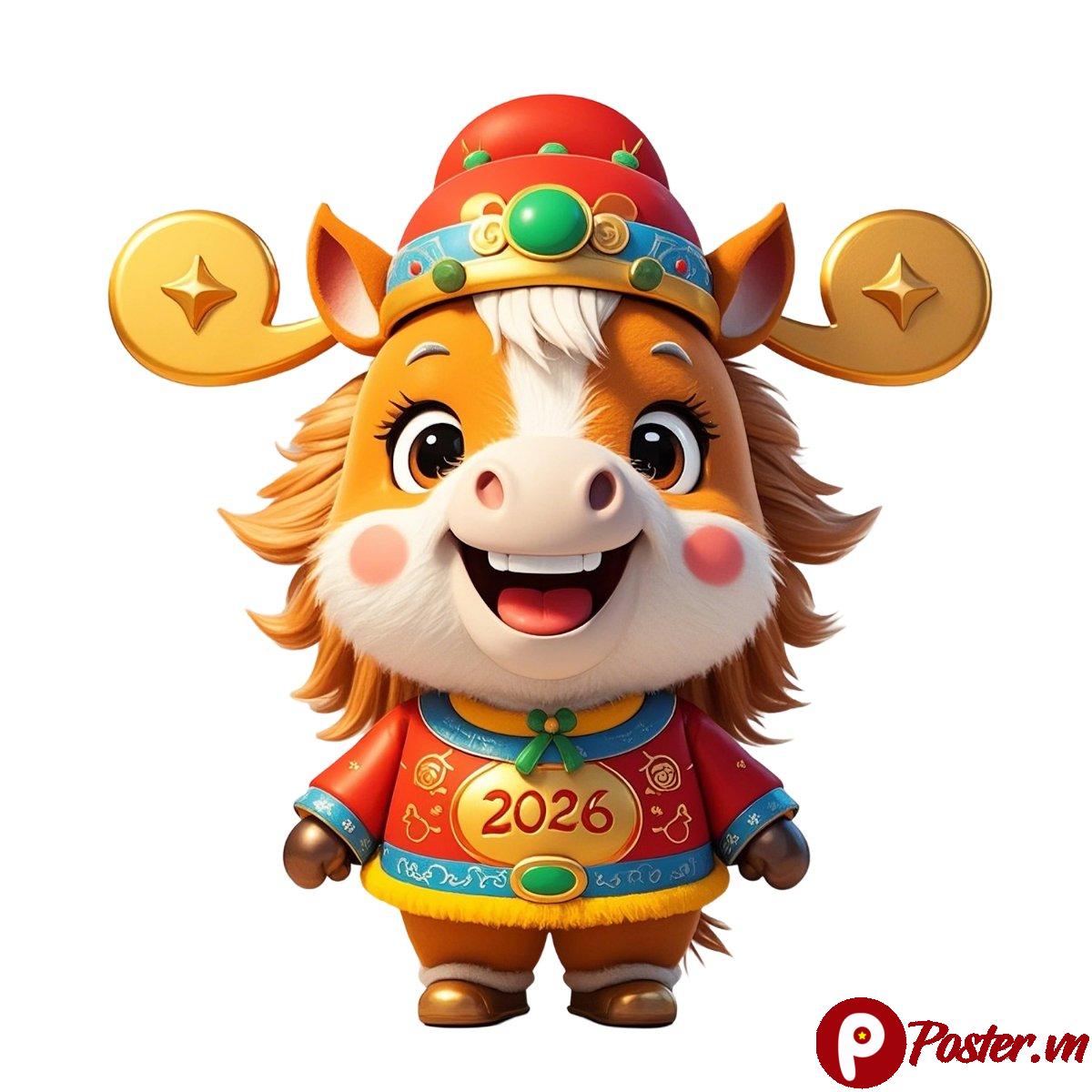 Mẫu ngựa 3D này được thiết kế với phong cách hoạt hình ngộ nghĩnh, đáng yêu, mang đến cảm giác tươi vui và tràn đầy năng lượng. Với tông màu đỏ chủ đạo, kết hợp cùng các chi tiết vàng óng ánh và xanh ngọc, hình ảnh chú ngựa trở nên nổi bật và thu hút mọi ánh nhìn. Đặc biệt, chú ngựa còn đội chiếc mũ truyền thống và mặc trang phục in số “2026”, khẳng định rõ nét chủ đề Tết Nguyên Đán.