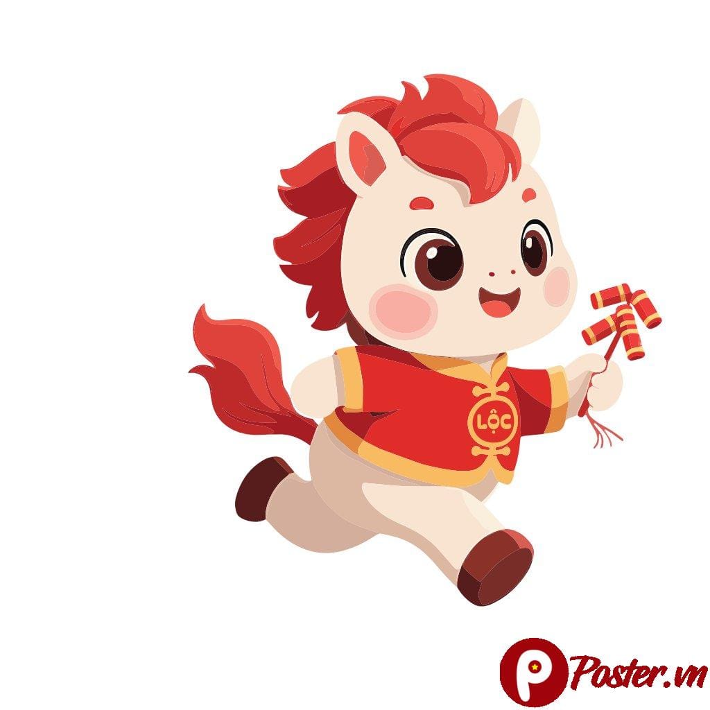 - Trang phục và phụ kiện truyền thống: Chú ngựa mặc một chiếc áo dài cách tân hoặc áo truyền thống kiểu Tôn Trung Sơn màu đỏ rực, với cổ tàu và các nút thắt dây đặc trưng. Tay phải chú cầm một chùm pháo tép nhỏ màu đỏ vàng, có dây tua rua, gợi nhớ đến những nét văn hóa đặc trưng của ngày Tết Việt Nam và Á Đông.