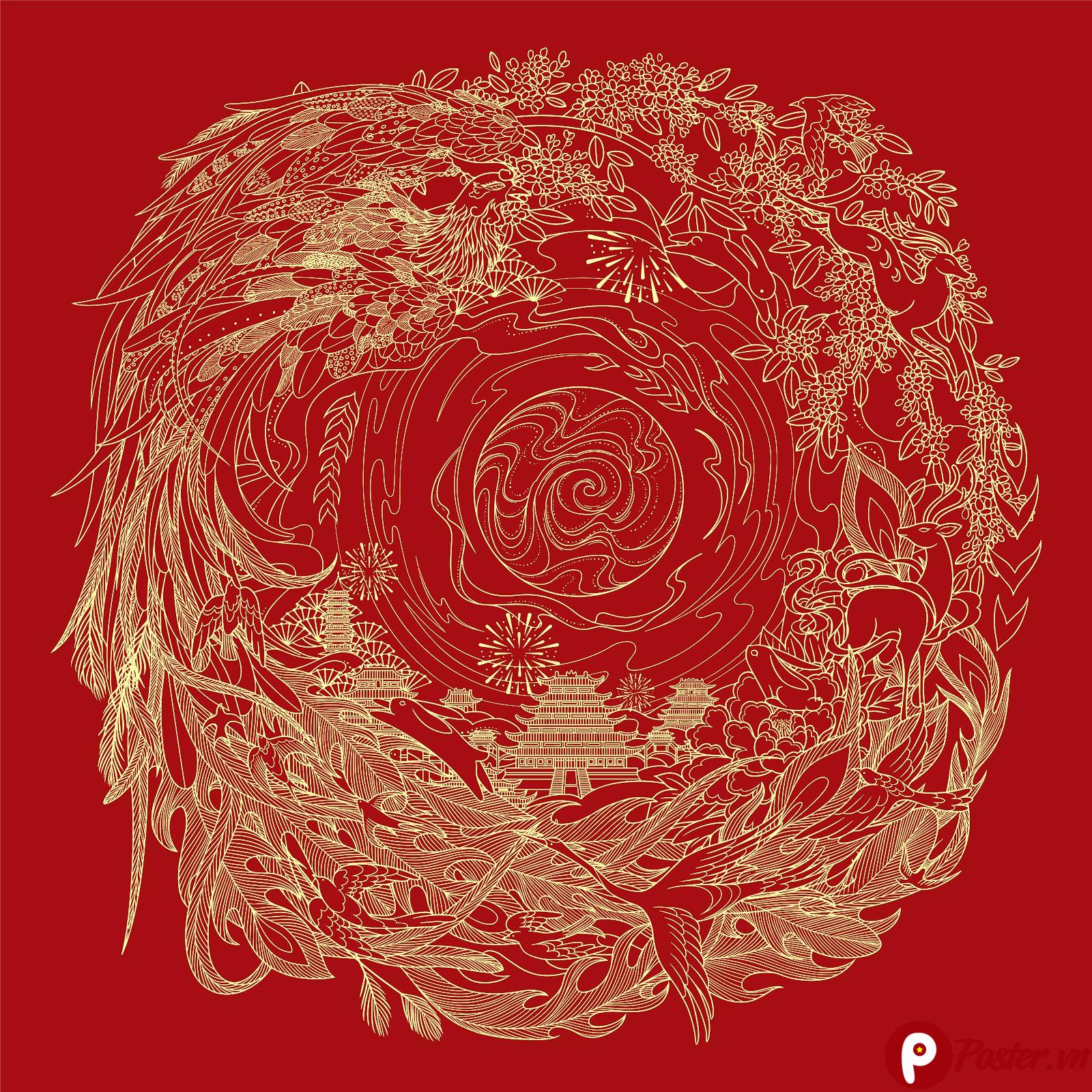 - Màu sắc Chủ đạo Sang trọng và Quyền quý: Sự kết hợp giữa nền màu đỏ tươi rực rỡ và các chi tiết màu vàng kim (gold) óng ánh là điểm nhấn đặc biệt. Màu đỏ tượng trưng cho may mắn, tài lộc, nhiệt huyết, trong khi màu vàng kim biểu thị sự giàu sang, quyền lực và thịnh vượng. Hai màu sắc này hòa quyện, tạo nên một tác phẩm vừa truyền thống vừa hiện đại, đầy sức sống và trang trọng.