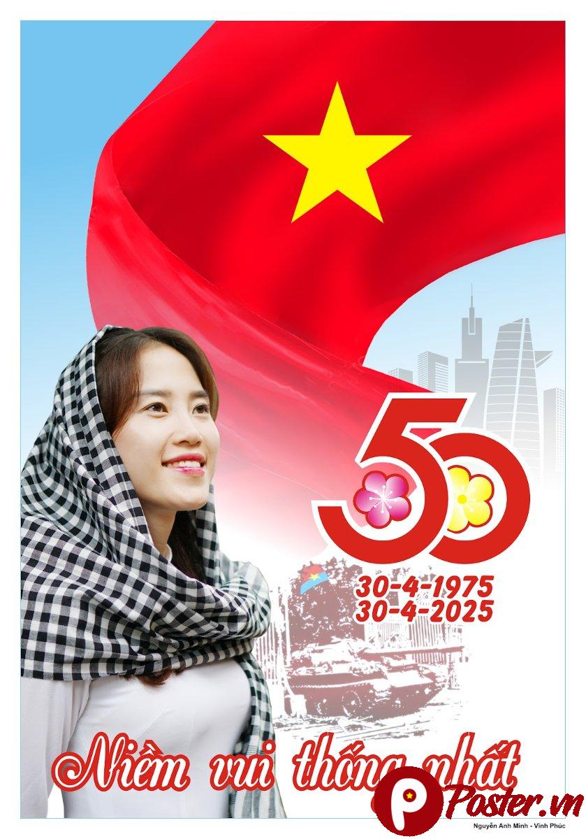 Mẫu poster này không chỉ là một ấn phẩm đồ họa đơn thuần mà còn là thông điệp ý nghĩa, gợi nhớ về một trong những sự kiện lịch sử trọng đại nhất của đất nước. Hình ảnh lá cờ đỏ sao vàng tung bay, biểu tượng 50 năm (30/4/1975 – 30/4/2025) cùng với hình ảnh người phụ nữ Việt Nam trong trang phục truyền thống, tất cả hòa quyện tạo nên một bức tranh sống động về niềm tự hào dân tộc và khát vọng hòa bình.