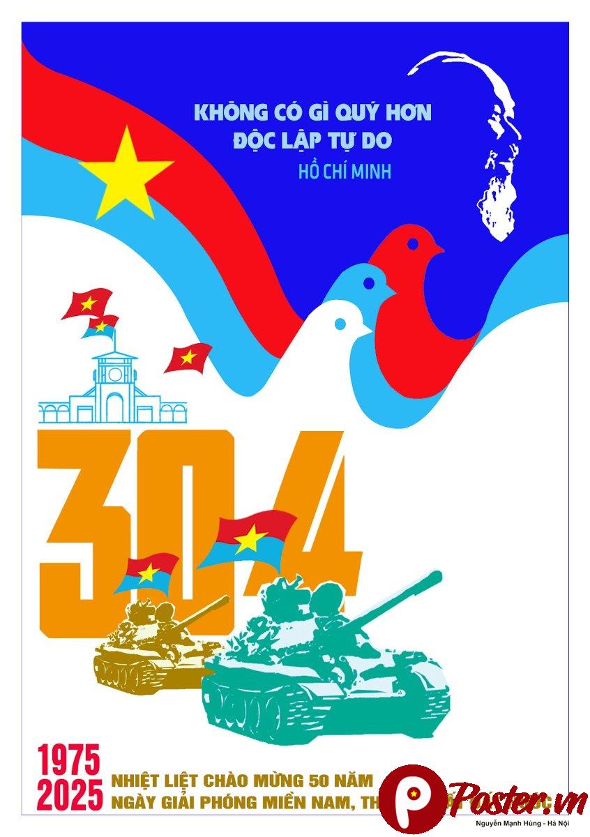 Mẫu poster kỷ niệm 50 năm ngày 30/4/1975-2025 của Poster.vn được xây dựng trên nền tảng của sự tôn vinh lịch sử và tinh thần đoàn kết dân tộc. Các biểu tượng như lá cờ Tổ quốc, hình ảnh Bác Hồ, chim bồ câu hòa bình, và những chiếc xe tăng lịch sử được sắp xếp một cách tinh tế, tạo nên một tổng thể hài hòa và đầy cảm xúc. Thông điệp “Không có gì quý hơn độc lập tự do” của Chủ tịch Hồ Chí Minh được đặt ở vị trí trang trọng, nhắc nhở về giá trị vĩ đại của hòa bình và độc lập.
