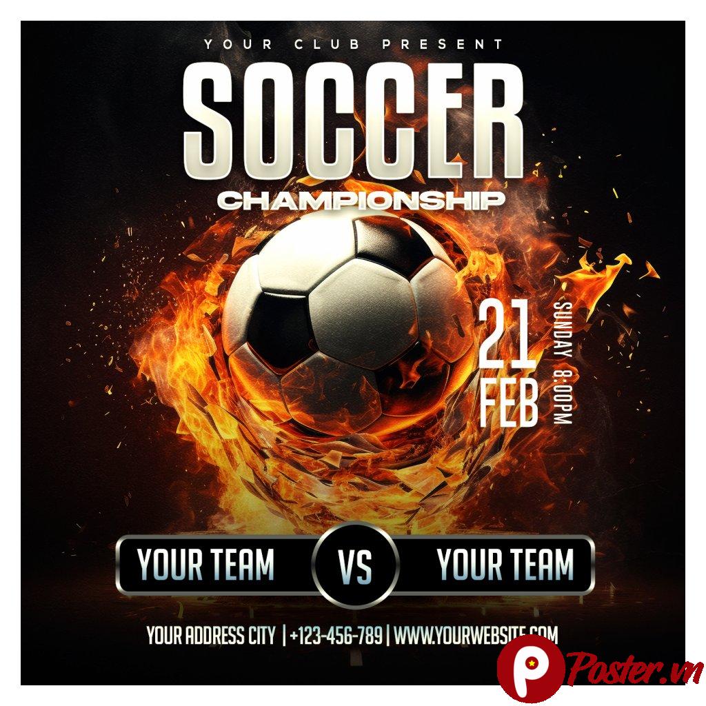 Phần tiêu đề “SOCCER CHAMPIONSHIP” được đặt ở vị trí trung tâm phía trên, sử dụng font chữ mạnh mẽ, dễ đọc, tạo ấn tượng về một sự kiện lớn và chuyên nghiệp. Các thông tin về ngày, giờ, địa điểm và tên đội bóng được sắp xếp khoa học, rõ ràng, giúp người xem dễ dàng nắm bắt. Đặc biệt, khu vực “YOUR TEAM VS YOUR TEAM” được thiết kế nổi bật, cho phép bạn dễ dàng điền tên các đội tham gia, tạo sự cá nhân hóa cho từng giải đấu.