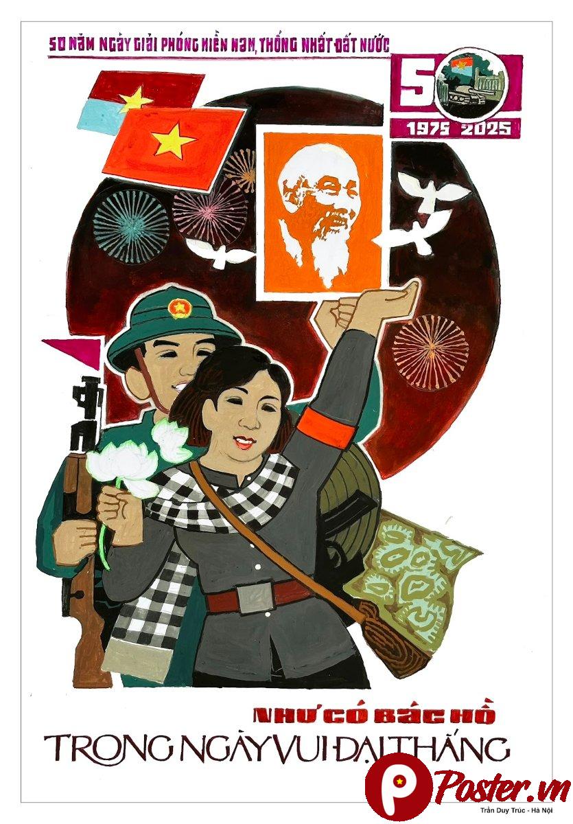 Phía trên là hình ảnh Chủ tịch Hồ Chí Minh, vị lãnh tụ vĩ đại của dân tộc, luôn dõi theo và dẫn dắt con đường cách mạng. Lá cờ đỏ sao vàng tung bay phấp phới cùng biểu tượng chim bồ câu trắng, tượng trưng cho khát vọng hòa bình và độc lập. Dòng chữ “NHƯ CÓ BÁC HỒ TRONG NGÀY VUI ĐẠI THẮNG” không chỉ là một lời khẳng định mà còn là sự tri ân sâu sắc đến công lao to lớn của Người.