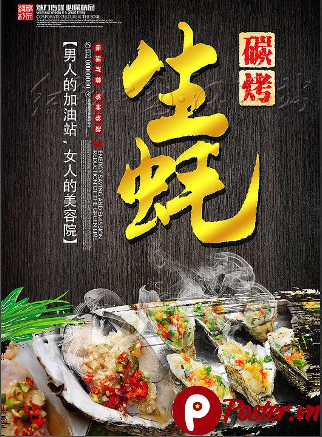- Chữ viết nghệ thuật: Tiêu đề “炭烤生蚝” (Hàu nướng than) được thiết kế với font chữ mạnh mẽ, màu vàng đồng nổi bật trên nền đen, tạo điểm nhấn thị giác mạnh mẽ.