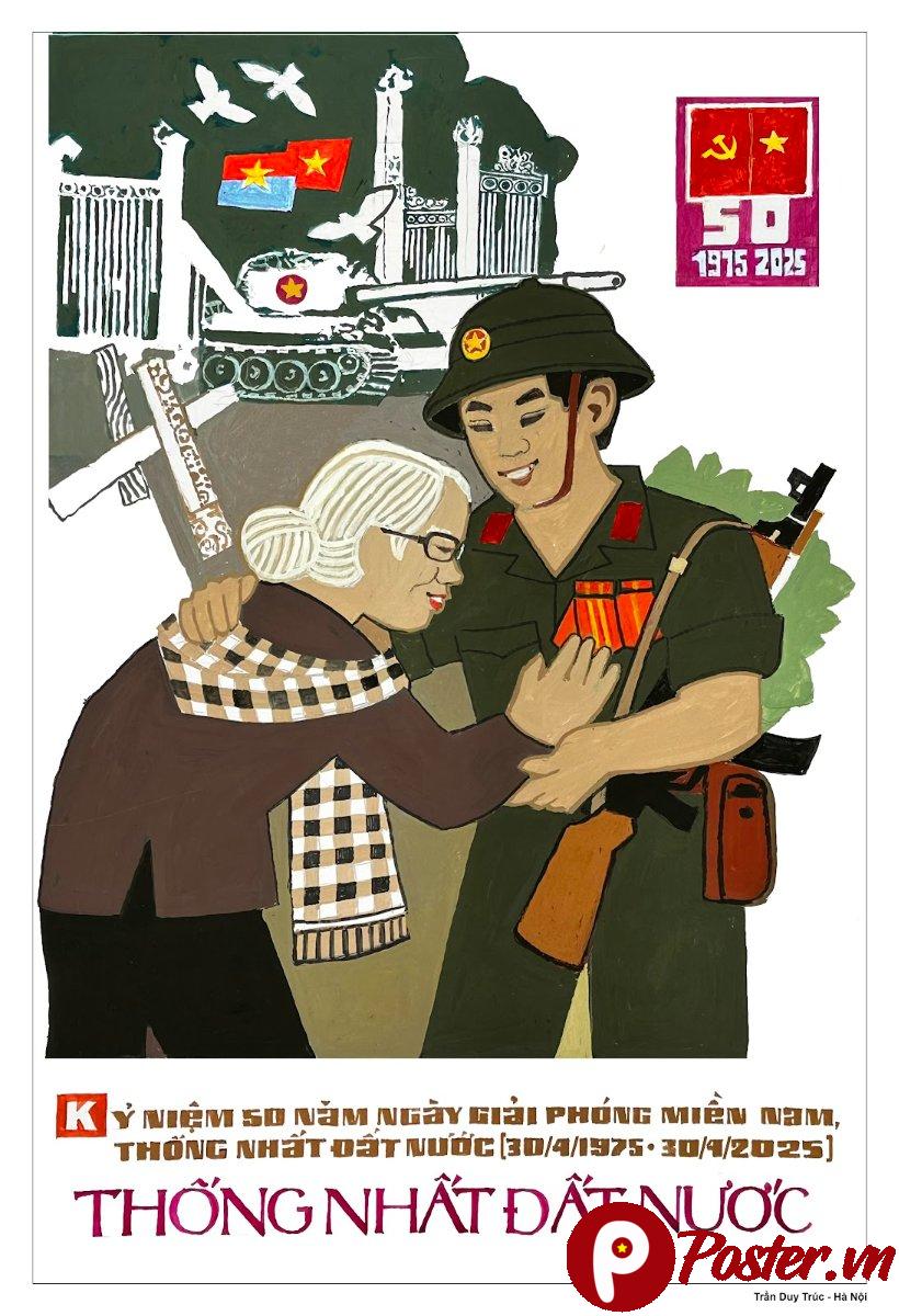 Mẫu poster này được thiết kế với sự kết hợp hài hòa giữa yếu tố lịch sử và giá trị nhân văn sâu sắc. Hình ảnh trung tâm là người lính trẻ và người mẹ già, tượng trưng cho sự hy sinh của thế hệ đi trước và niềm tự hào của thế hệ hôm nay. Phía sau là hình ảnh xe tăng, cờ Tổ quốc tung bay, cùng dòng chữ “KỶ NIỆM 50 NĂM NGÀY GIẢI PHÓNG MIỀN NAM, THỐNG NHẤT ĐẤT NƯỚC (30/4/1975 – 30/4/2025)” và “THỐNG NHẤT ĐẤT NƯỚC”, tất cả đều được thể hiện một cách trang trọng và đầy cảm xúc.